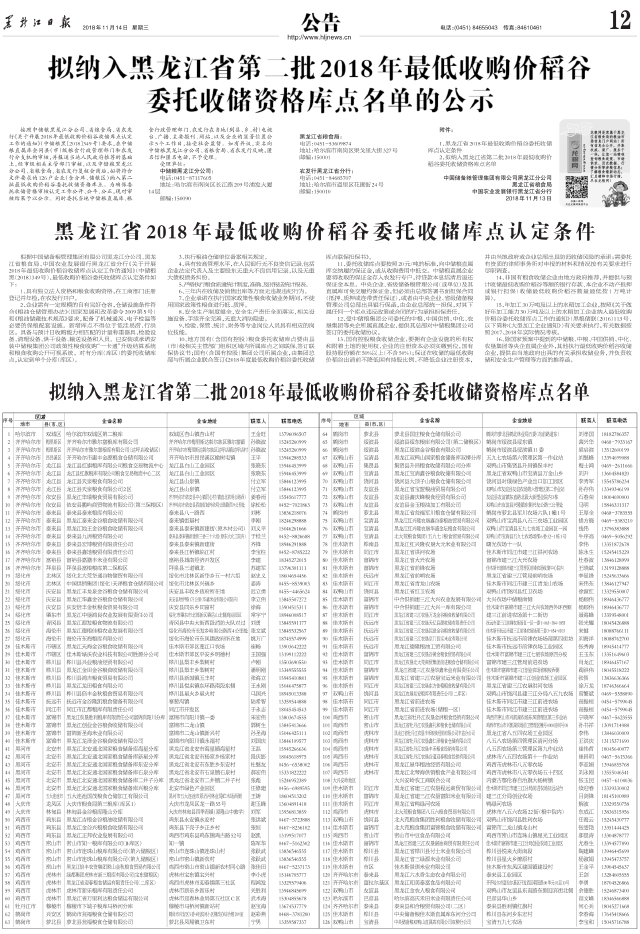 拟纳入黑龙江省第二批2018年最低收购价稻谷委托收储资格库点名单的公示