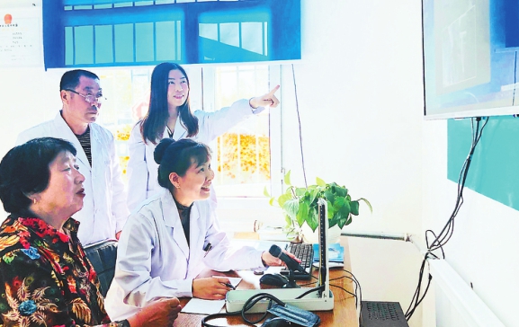 日前,在双兴镇双利村卫生室,村医正在为村民进行远程会诊,一根网线就连接到县城医院的专家。据悉,按照精准扶贫要求,明水县2年来新建57个村级卫生室,真正做到了小病不出村。 高伟本报记者程瑶摄
