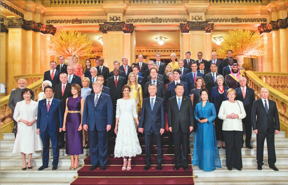 当地时间11月30日,二十国集团领导人第十三次峰会在阿根廷布宜诺斯艾利斯举行。当晚,国家主席习近平和夫人彭丽媛同出席峰会的各代表团团长夫妇集体合影。新华社记者李学仁摄