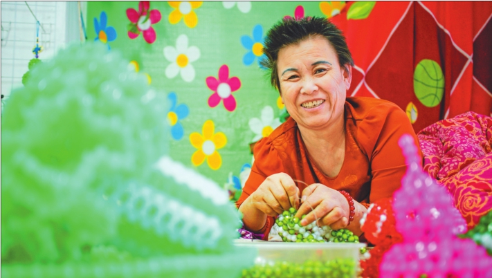 □文/摄本报记者刘心杨 俗话说“靠人吃饭空米缸,下田流汗谷满仓”。在桦南县桦南镇太平村,就有这样一名身残志坚的贫困户,疾病与贫穷并没有消磨她的意志,反而激发她勇摘“穷帽”的斗志。依靠制作手工艺品的本领,她从贫困户变身帮助他人脱贫的致富带头人,张秀华的脱贫故事令人动容。 走进张秀华的家,屋子不大但收拾得干净整洁。桌子上、柜子上摆满了张秀华的作品,翡翠白菜、干果匣子、纸抽盒……一件件精美的手工制品令人眼花缭乱。因为患有重症皮肌炎,下半身失去知觉的张秀华只能趴在床上做手工。在她伸手可及的地方,摆放着制作手工所需的原材料以及未制作完成的半成品。只见她用左手拿起一条彩带,右手捻起两粒彩色珠子,左右手娴熟配合,十几分钟的时间,一枚精致的发卡便制作完成了。“像发卡、钥匙扣这些简单的手工艺品我一天能做十几个,一个卖几元钱,像纸抽盒等复杂点工艺品耗时长,但价格也高些。现在一个月能卖一千多元钱,足够一家人的日常开销了。我身体有残疾,没法照顾家里,屋里屋外都是我爱人赵春生一个人忙乎,我看着心疼,我也想为这个家做点力所能及的事,这也是我开始制作手工艺品的原因。” 想法虽好,但几年前的张秀华还是个手工“门外汉”。一枚简单的钥匙链拆了又缝,缝了又拆,手被针扎了一个又一个口子。爱人看她如此辛苦也曾劝她放弃,但张秀华凭借着一股不服输的韧劲,在网上看视频、学教程,在一次次的尝试后,张秀华终于摸清了“门道”。掌握技巧后,制作效率也从最初的几天做一个到现在的一天十几个,张秀华的手工制品越做越熟练,越做越精致。在桦南县第三届商洽会义卖上,她的手工艺品成了抢手货,当天就卖3700余元。“朋友圈”、“快手”、“火山小视频”都是她的卖场。“我在火山小视频有几百名粉丝,他们知道我的情况后也经常光顾我的生意,就这两个月我在火山小视频上就卖了将近2000元钱。” 随着生意越来越好,家中为了给张秀华看病所欠下的债务也基本还清。尝到甜头的张秀华萌生帮助其他贫困户增收的念头,“这些手工制品不愁卖,而且门槛不高,只要用点心谁都能干。”就这样,身为贫困户的表姐张秀容成了她的第一个徒弟,“我在她这儿学了十几天就出徒了,现在我也经常做些小玩意儿拿到集市上去卖。虽然钱不多,但靠自己的双手赚钱,心里美啊。马上冬闲了,我们村不少姐妹都在她这儿学手艺,闲来无事在家做几个,也能贴补点家用。” 现在张秀华每天都会在朋友圈更新展示自己的得意新作。生活越过越好了,她对未来充满了信心。 趴在床上的张秀华依然乐观积极。