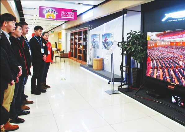 18日上午,哈尔滨市道里区友谊路附近一家商场内,电视机播放庆祝改革开放40周年大会,商场员工和市民驻足观看。 本报记者苏强摄