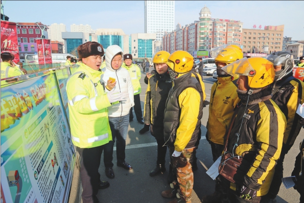 佳木斯市交警支队联合市教育局、市公路管理处、玉禾田环境发展集团股份有限公司佳木斯分公司等多家单位共同举办了全国交通安全日主题宣传活动。活动现场,各大队播放了交通文明公益视频,展示了交通安全宣传图板,并组织民警向送餐行业代表及市民群众发放交通安全提示手册,面对面讲解交通安全。 朱曼琪宋洋摄