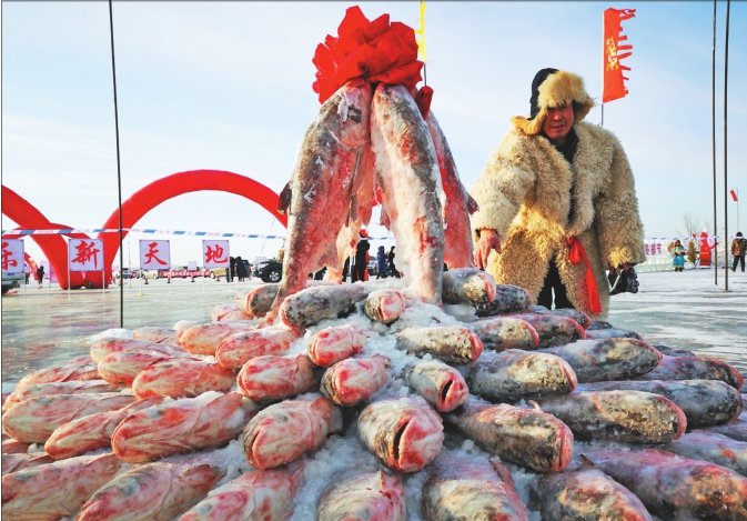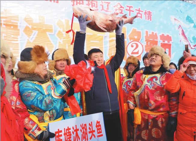 “出鱼啦!”随着一声吆喝,第一网鱼从1号冰窟窿缓缓露出水面,一条条鲜活的大鱼打捞上岸。 1日,由北大荒集团、农垦绥化管理局涝洲鱼种场、农垦库塘沐湖渔业公司主办的北大荒(涝洲)库塘沐湖首届冬捕节在库塘沐湖盛大启幕。数万游客从全国各地赶到这里,共同见证了涝洲新年的第一网鱼。现场拍卖的头鱼为24.4公斤的野生胖头鱼,以188888元的价格,被北京的客商竞拍成功。 库塘沐湖位于哈尔滨松花江北岸,与哈尔滨太平国际机场隔江相望。距哈尔滨市区45公里,是哈尔滨市周边300公里内最大的天然湖泊。库塘沐湖湖面呈月牙形,水域总面积8000余亩,与松花江水系相连,水质清澈无污染,盛产野生胖头、鲤鱼、草鱼、鲢鱼、鳙鱼等常见淡水鱼种,还出产大白鱼、鳌花鱼、鲟鳇鱼等珍贵寒地淡水鱼种。 左图:头鱼竞拍成功。 右图:大鱼摆出的造型。 本报记者吴树江刘楠摄影报道