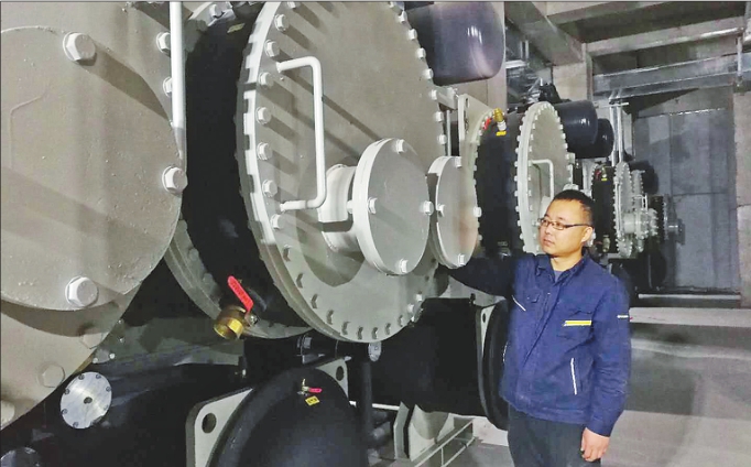 技术人员在巡检污水源热泵锅炉。 本报记者李宝森摄