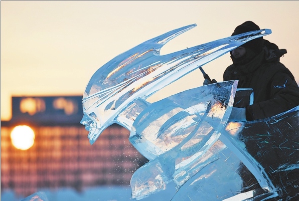 1月7日,参赛者在进行冰雕创作。 当日,在哈尔滨冰雪大世界园区进行的第三十三届中国哈尔滨国际冰雕比赛进入第二天,参赛的冰雕作品已初露芳容。 新华社记者王建威摄