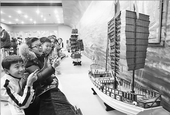 9日,哈尔滨工程大学船舶博物馆内,许多中小学生在观看、了解船舶发展历程及最新的舰艇模型。据了解,这座博物馆以船舶的发展史为主线,展示了海运、海洋、海防等多个领域的数十艘舰船模型。寒假期间,博物馆免费向中小学生开放,让孩子们感受祖国日新月异的发展变化。金声本报记者苏强摄
