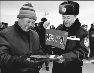 春运大幕已拉开,交警为乘客发放交通安全宣传春联。 本报记者马智博摄
