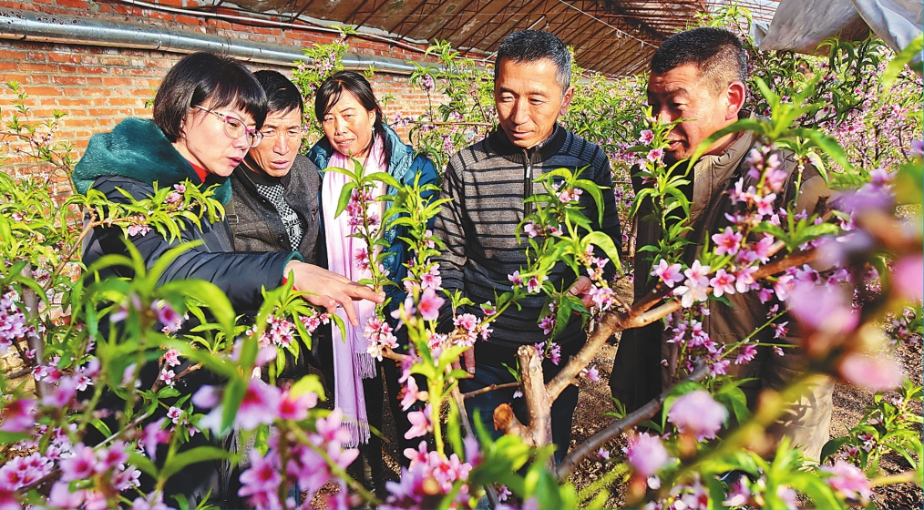 这是在宁安市兰岗镇古塔现代农业观光园内,高级农艺师石泓(左一)向学员介绍油桃树花期的管理常识要点。