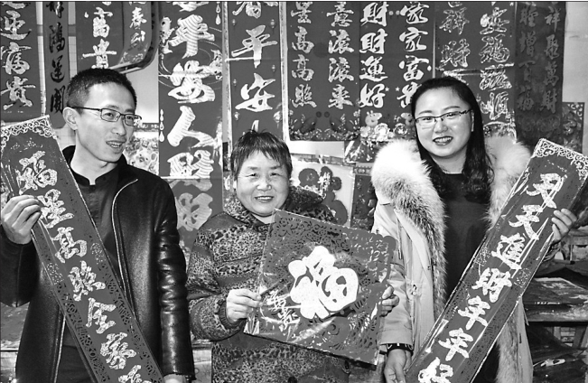 董传宗和妻子王艳秋与合作社社员罗彦珍在城里置办年货。