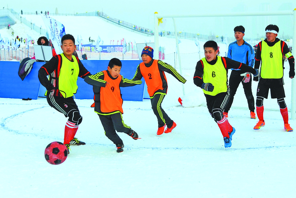 中小学生在哈尔滨市群力赏冰乐雪园内玩雪地足球。