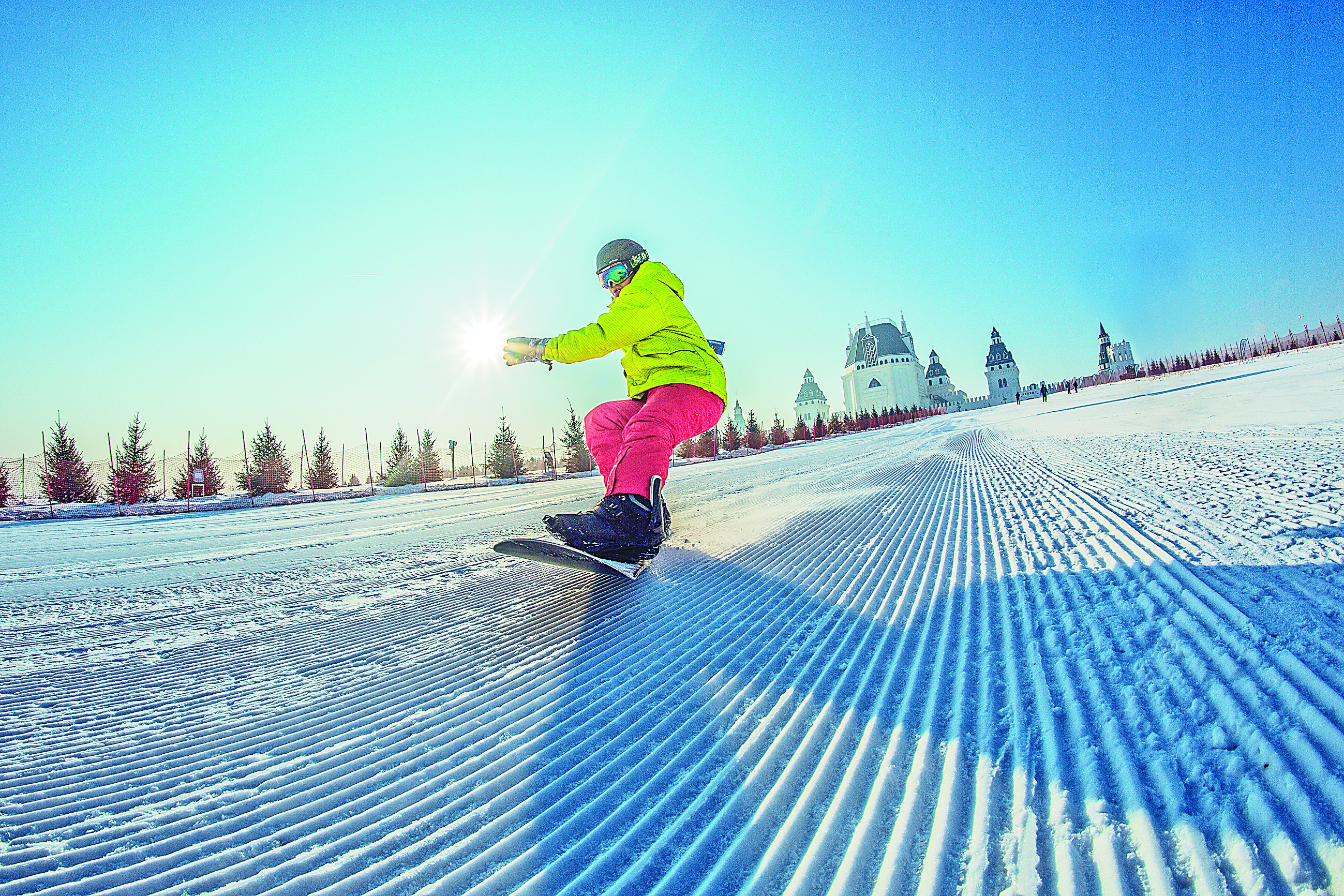 哈尔滨市呼兰河口湿地公园欢乐冰雪世界内游客穿起雪板风驰电掣。