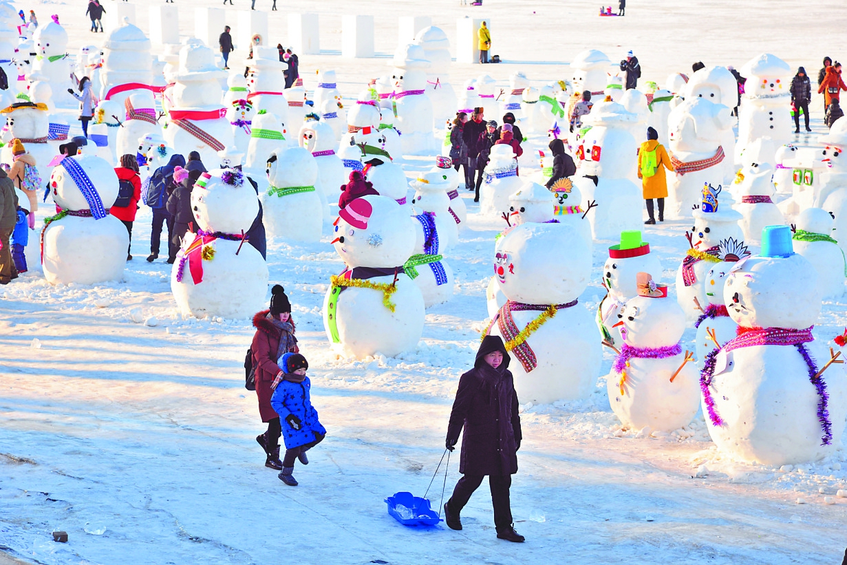 松花江畔游人与雪人相伴。