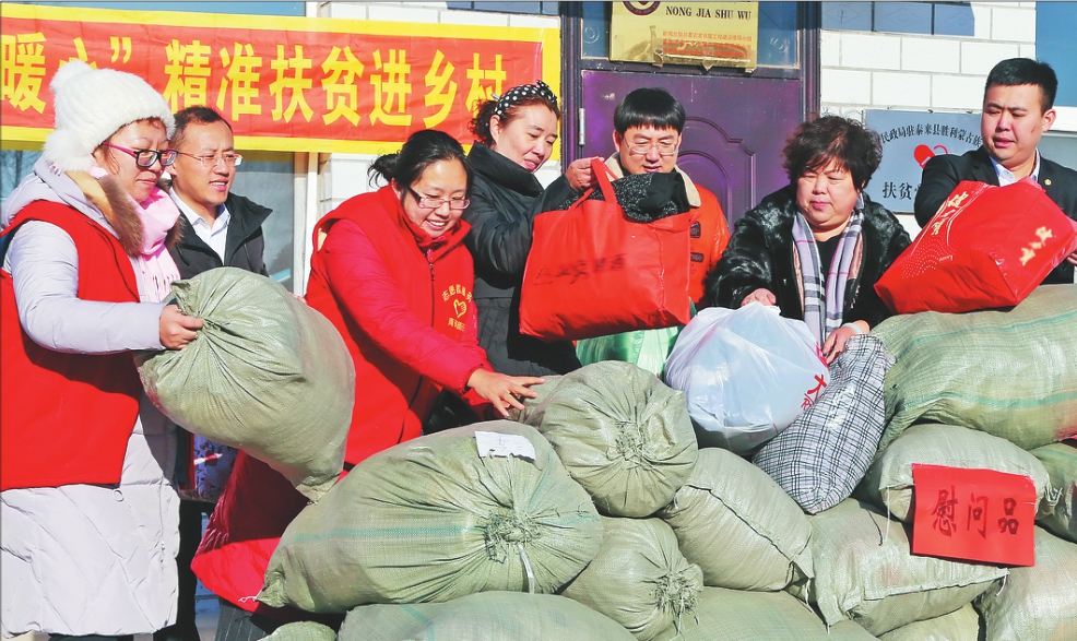 ↑齐齐哈尔市铁锋区南浦街道南化社区“红色联盟”开展“衣暖心”精准扶贫进乡村活动,捐赠的3000余件(套)衣物和被褥送到泰来县胜利蒙古族乡扶贫爱心超市,按需发放到贫困村民手中。 黄洋本报记者姚建平摄