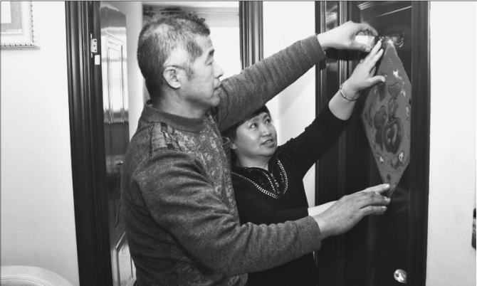 金龙两口子为迎接新春贴福字。 刘学海摄