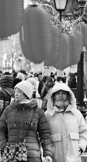16日,哈尔滨中央大街上挂起了数百个红灯笼,吸引了许多市民和游客驻足赏灯、猜谜。