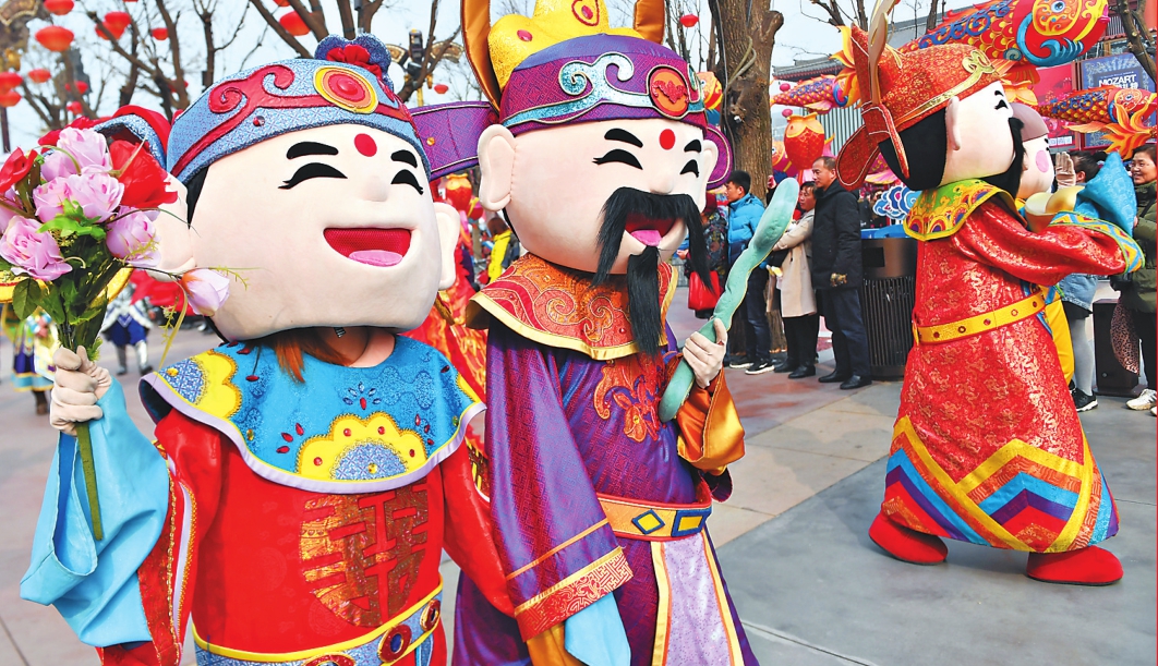 2月19日,花车巡游队伍在西安大唐不夜城·现代唐人街上巡游演出。