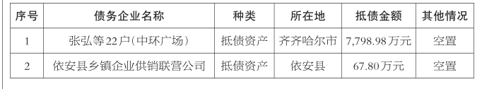 中国长城资产管理股份有限公司黑龙江省分公司拟对从中国农业银行股份有限公司齐齐哈尔分行收购的2户抵债资产项目进行处置,情况如下: 抵债资产情况: 1、张弘等22户(中环广场)抵债资产:抵债金额为77,989,767.76元,抵债资产坐落于齐齐哈尔市龙沙区中环广场2号楼B区,建筑面积合计7,946.69平方米,包括一、二层商服和地下一层车位,其中:地下一层1,582.60平方米、地上一层3,386.23平方米、地上二层2,977.86平方米。裁定取得,未过户。抵债资产位于齐齐哈尔核心商业区,位置稀缺,黄金地段,建成于2003年,现空置中。 2、依安县乡镇企业供销联营公司抵债资产:抵债金额为678,000.00元,抵债资产坐落于依安镇西北街石油公司综合楼西-8门,建筑面积91.94平方米,一楼商业,房屋所有权人为中国农业银行股份有限公司依安支行。抵债房产建于1990年,混合结构,临明安路,距依安火车站约2.2公里,现空置中。 具体情况请投资者登录资产公司对外网站查询或与资产公司有关部门接洽(htt p://www.gwamcc.com)。 处置方式:债务减免、协议转让、拍卖、要约邀请竞价转让、挂牌转让及其他处置方式。 交易对象资格和交易条件:具有完全民事行为能力、支付能力的法人、组织或自然人(国家公务员、金融监管机构工作人员、政法干警、金融资产管理公司工作人员、国有企业债务人管理层以及参与资产处置工作的律师、会计师、评估师等中介机构人员等关联人或者上述关联人参与的非金融机构法人,以及与参与不良债权转让的金融资产管理公司工作人员、国有企业债务人或者受托资产评估机构负责人员等有直系亲属关系的人员除外)。 公告发布日期:2019年3月4日 有效期:6个月 交易条件:一次性付款或分期付款。 上述债权自本公告发布之日起20个工作日内受理对上述债权资产相关处置的征询和异议,以及有关排斥、阻挠征询或异议以及其他干扰资产处置公告活动的举报。 以上信息仅供参考,最终以借据、合同、法院判决等有关法律资料为准。 受理公示事项 联系人:黄女士 王女士 联系电话:0451-53628836 53623146通讯地址:哈尔滨市南岗区红军街10号 邮政编码:150001 监察审计部门联系人:王先生 联系电话:0451-53622431中国长城资产管理股份有限公司黑龙江省分公司 2019年3月4日