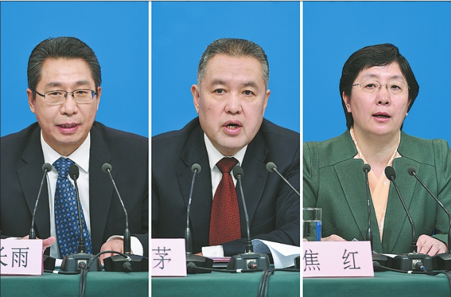 3月11日,十三届全国人大二次会议新闻中心举行记者会,邀请国家市场监督管理总局局长张茅(中)、国家药品监督管理局局长焦红(右)、国家知识产权局局长申长雨(左)就“加强市场监管维护市场秩序”相关问题回答中外记者提问(拼版照片)。 新华社记者王鹏摄