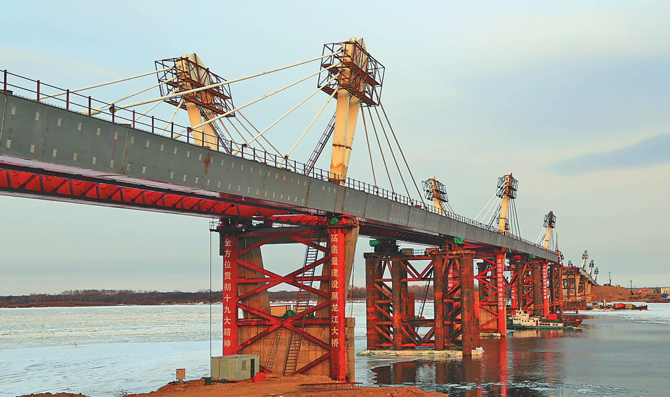 3月5日,黑龙江公路大桥的中方部分的主桥钢箱梁顶推全部完成。据悉,黑龙江公路大桥钢梁顶推施工采用多点步履式顶推,从开始顶推到顶推全部完成,施工建设者经过近125天夜以继日的奋战,完成顶推555.75米。目前,工人们正加紧进行合龙段的悬臂吊装及落梁准备工作,以确定大桥线性位置。一江之隔的俄罗斯也在同时作业,大桥距离合龙不到百米。 宋福来本报记者李民峰摄
