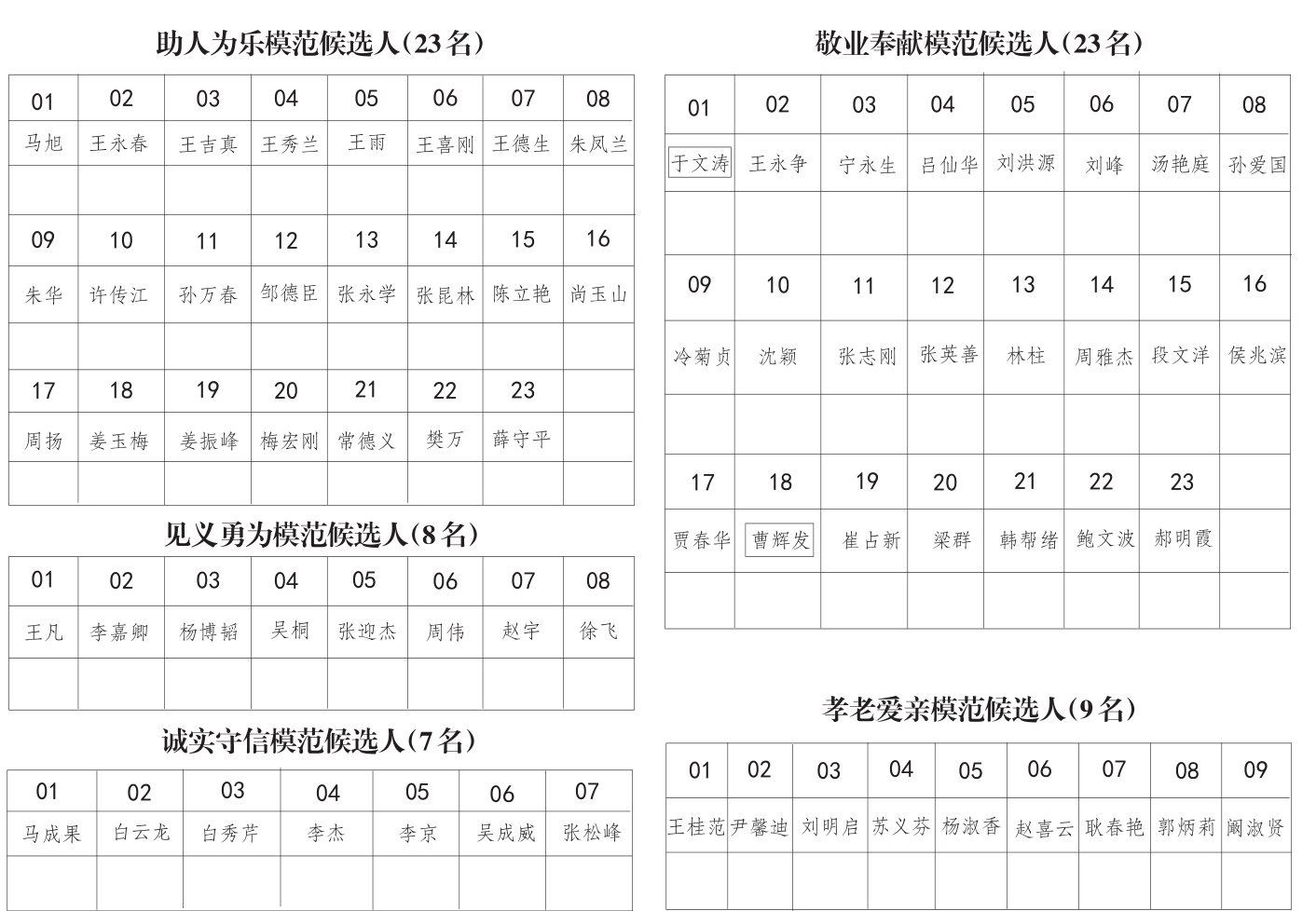 第七届黑龙江省道德模范评选活动由省委宣传部、省文明办、省委政法委、省诚信办、省军区政治工作局、省总工会、团省委、省妇联、黑龙江日报报业集团、黑龙江广播电视台、东北网共同举办,本次评选拟表彰30名左右省级道德模范。为确保评选活动公平、公正、公开,希望广大群众踊跃投票,推选出您心目中的道德模范。 一、投票时间 3月25日上午10时-3月31日上午10时。 二、投票平台 1.黑龙江日报刊印书面选票; 2.东北网设置网络投票平台; 3.黑龙江文明网设置网络投票链接; 4.“文明龙江”微信公众号设置投票平台。 三、投票方法 1.填写报纸选票。3月25日,黑龙江日报刊登第七届黑龙江省道德模范候选人名单和选票,简要事迹详见东北网。本次评选共分为5类,每一类必选2名(选中人物下划“√”),少选或多选为无效票。复印或翻印的选票无效。选票请于4月5日前(以当地寄出日期邮戳时间为准)寄到第七届黑龙江省道德模范评选委员会办公室(黑龙江省文明办秘书处)。地址:哈尔滨市南岗区果戈里大街327号;邮编:150001;联系电话:(0451)53622398。逾期一律不予受理。 2.网络投票。3月25日,东北网、黑龙江文明网开设“第七届黑龙江省道德模范评选投票”专栏,打开该专栏之后,按程序点击投票。网络投票规则:本次评选共分为5类,每一类必选2名,少选或多选为无效票,一个身份证号、同一IP地址24小时内投一次。东北网网址:htt p://www.dbw.cn;咨询电话:(0451)87116818,工作时间:周一至周五8:30-17:00。 3.微信投票。3月25日,“文明龙江”微信公众号开设“第七届黑龙江省道德模范评选投票”专栏,打开该专栏之后,按程序点击投票。微信投票规则:本次评选共分为5类,每一类必选2名,少选或多选为无效票,每个微信号24小时内可投5次。 为保证活动的公平公正,郑重声明:一旦发现刷票行为,立即停止该候选人的投票资格。 第七届黑龙江省道德模范评选委员会办公室2019年3月25日