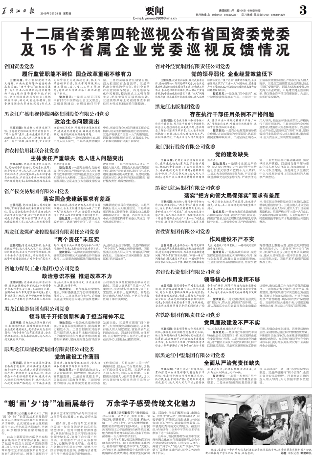 主要问题:党委领导核心作用发挥不够,企业改革发展推进缓慢;思想政治建设薄弱,党员教育管理不到位,存在重业务轻党建问题;“两个责任”落实不到位,“四资一项目”问题突出;作风建设不严不实,个别领导干部担当意识不强,人浮于事、懒政怠政现象屡有发生;对整改工作不重视,上一轮巡视反馈问题整改不到位。 整改意见:一是提高政治站位,充分发挥党委的政治核心和领导核心作用,深化企业改革,推进企业全面提质增效。二是加强党的基层组织建设,把党员教育管理摆上重要位置,提升党组织的凝聚力和战斗力。三是强化“两个责任”落实,加强作风建设,突出对集团关键岗位、重点人员特别是一把手的监督,加大执纪问责力度。四是不折不扣抓好巡视整改工作。