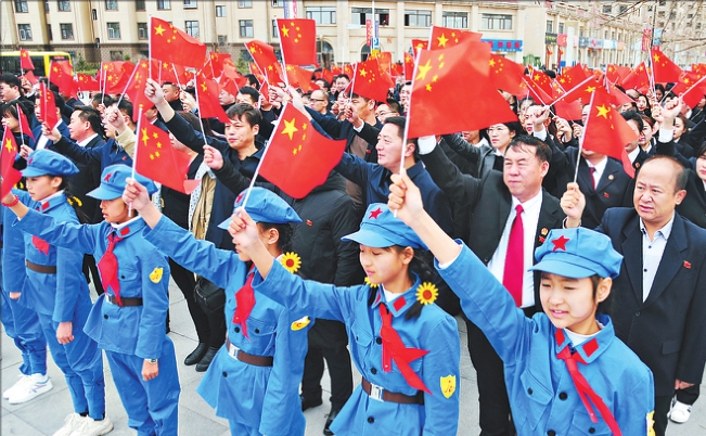 13日,抗日英雄冷云的故乡桦川县举行“共和国长子的家国情怀”佩戴国旗徽章活动。 本报记者荆天旭摄