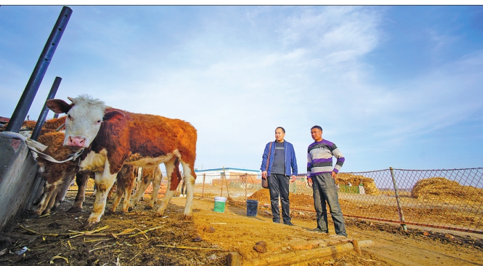陈飞(左)引导先锋村发展养牛产业。 本报记者刘心杨摄