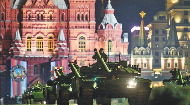 5月4日,在俄罗斯首都莫斯科,坦克在阅兵彩排上行驶。俄罗斯莫斯科将于5月9日举行庆祝卫国战争胜利74周年阅兵。 新华社发
