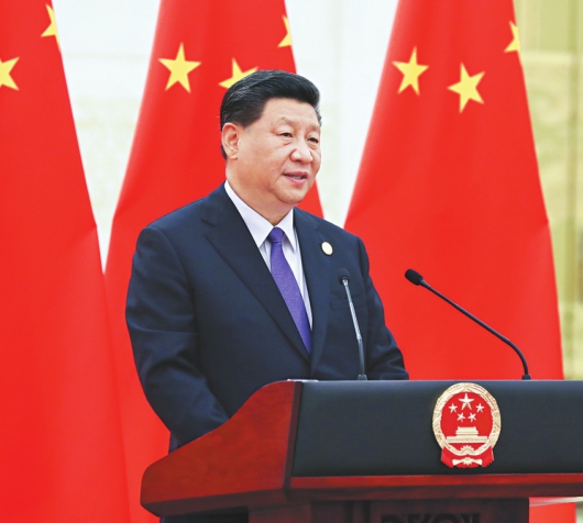 5月14日,国家主席习近平和夫人彭丽媛在北京人民大会堂举行宴会,欢迎出席亚洲文明对话大会的外方领导人夫妇及嘉宾。这是习近平在宴会上发表致辞。 新华社记者鞠鹏摄