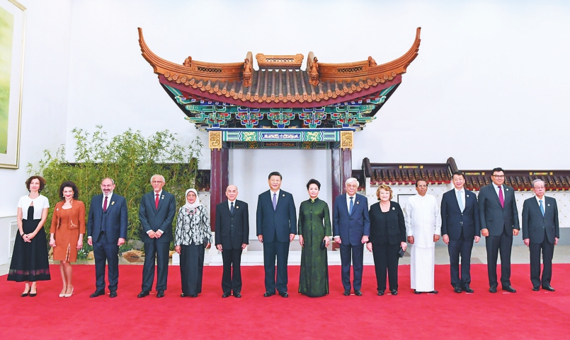 5月14日,国家主席习近平和夫人彭丽媛在北京人民大会堂举行宴会,欢迎出席亚洲文明对话大会的外方领导人夫妇及嘉宾。这是习近平和彭丽媛同外方领导人夫妇及嘉宾合影。新华社记者饶爱民摄