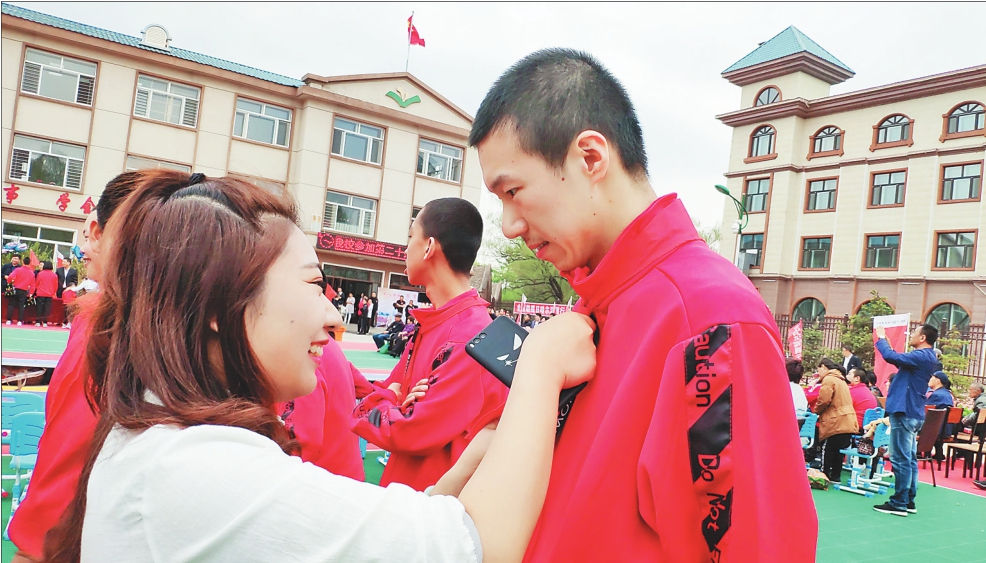 绥棱特殊教育学校教师为学生整理衣装。李磊本报记者程瑶摄