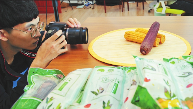 90后的退伍军人施璐瑶,回到家乡肇东市与朋友创办了肇东市经点互联网农副产品零售有限责任公司。在肇东市政府的帮助和自己努力下,今年初,他们与黑龙江王老宝食品有限公司签订了粘玉米在天猫网店的市场销售合同。截止到目前,累计销售额达到104万元,利润达到25万元。图为施璐瑶在为自己的电商产品拍摄展示图片。 本报记者荆天旭摄