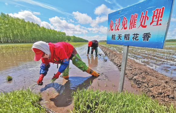 农场员工在航天水稻田里补苗。 本报记者吴树江摄