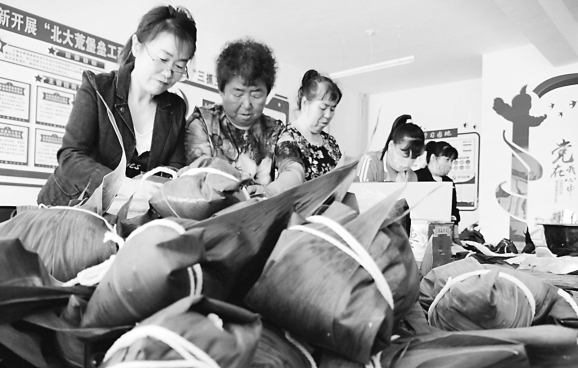 五大连池农场社区党支部携手辖区爱心志愿者,在端午节期间为困难家庭、离退休老党员、独居老人包起各式粽子、制作七彩葫芦,送去党和政府的温暖。 陆文祥范方鹤本报记者吴树江摄