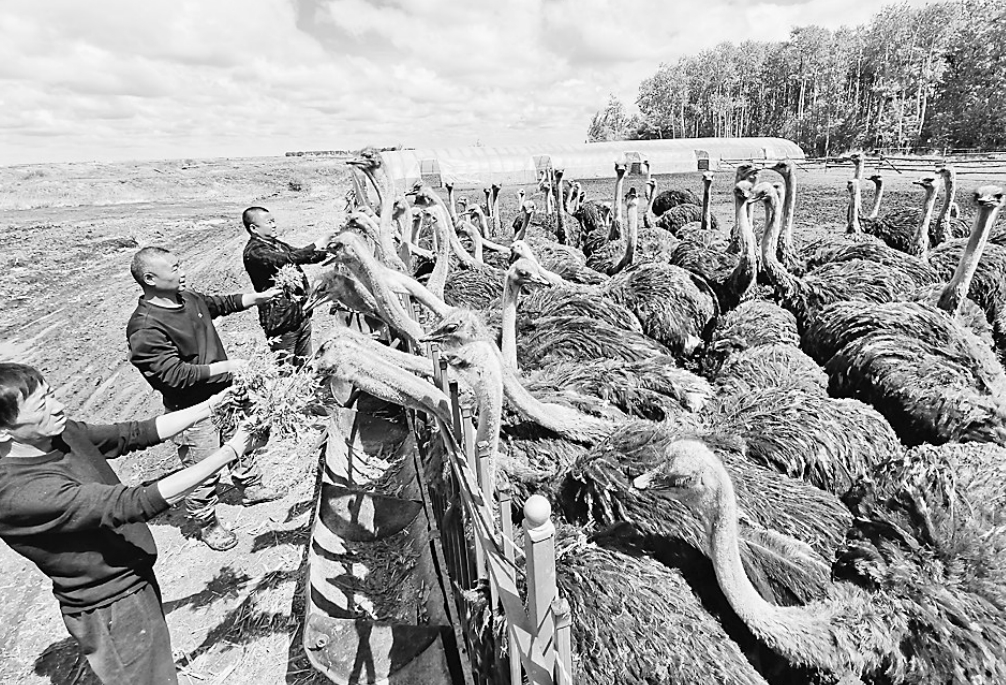大兴农场第七管理区二十作业站养殖户王继江积极发展特色养殖,4人合伙投入40余万元,饲养100只鸵鸟,发展循环经济。目前,王继江已经与虎林鸵鸟养殖基地签订回收订单,每斤售价18元,效益可观。 梁世超本报记者吴树江摄