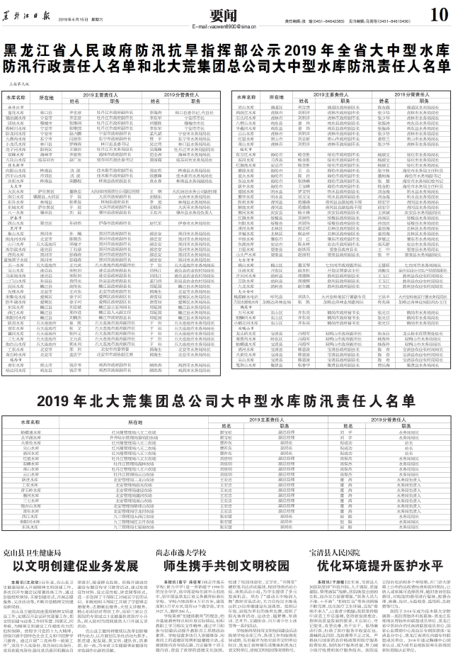 黑龙江省人民政府防汛抗旱指挥部公示2019年全省大中型水库防汛行政责任人名单和北大荒集团总公司大中型水库防汛责任人名单