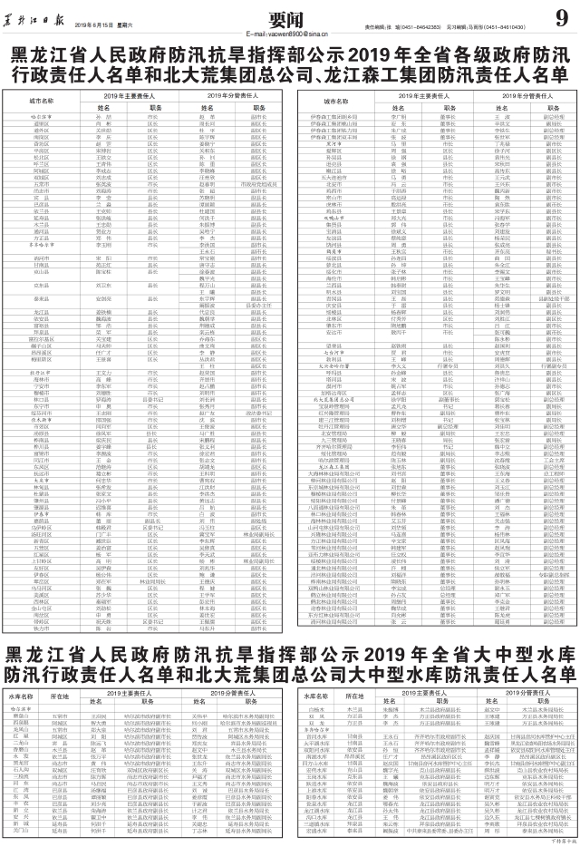 黑龙江省人民政府防汛抗旱指挥部公示2019年全省各级政府防汛行政责任人名单和北大荒集团总公司、龙江森工集团防汛责任人名单