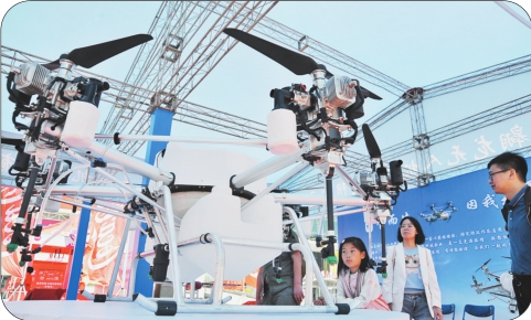 一家参展商带来了各种无人机,其中一台植保无人机载重量近百公斤,吸引了众人的目光。 本报记者苏强摄