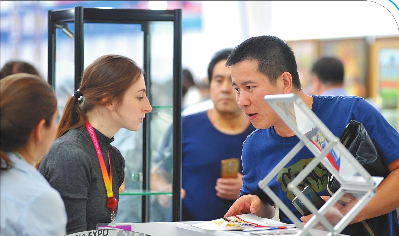 ↑展会上,许多中国客商与俄罗斯客商洽谈合作,涉及矿产、旅游、食品、服装等多个方面。 本报记者苏强摄