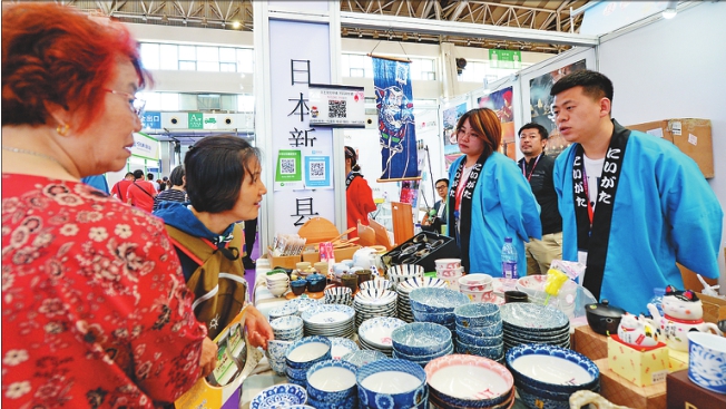 日本新潟县这次带来的青花瓷餐具受到与会客商的喜欢。本报记者邵国良摄
