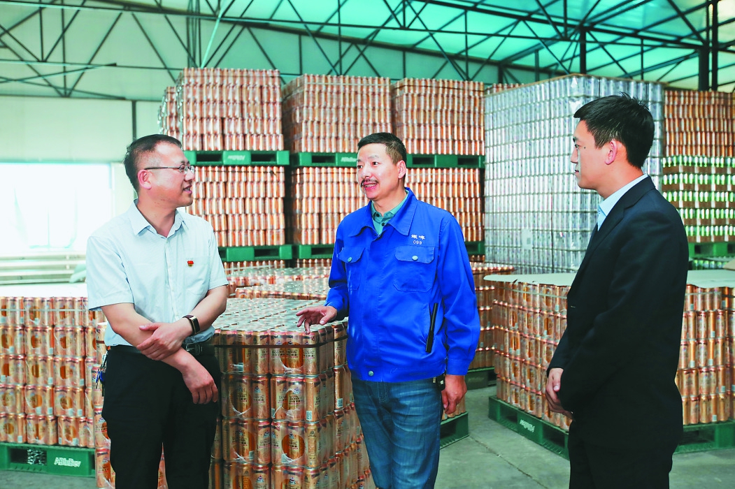 冰花啤酒法定代表人宫会民(中)向邮储银行团队介绍生产经营状况。