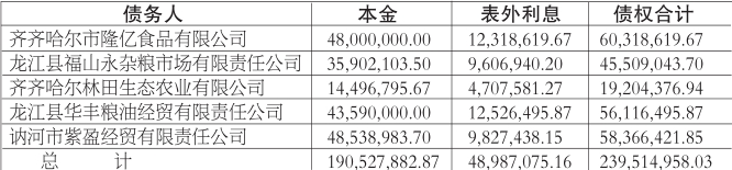 中国长城资产管理股份有限公司黑龙江省分公司拟对从中国农业发展银行黑龙江省分行收购的下列资产进行营销,详见下表(利息计算截止至2018年8月31日): 单位:元债权情况: 1、齐齐哈尔市隆亿食品有限公司:该户本金余额48,000,000.00元,利息12,318, 619.67元,贷款方式为保证、抵押。该企业贷款抵押物为:①隆亿公司名下位于齐齐哈尔市富拉尔基区开发区启动区内纬三路南,一处土地使用权,面积为69440.07平方米,权属性质国有建设用地,用途为工业用地,他项权利证号为齐土籍他项(2014)第000278号,对应债权为1900万元;②机器设备:生猪屠宰生产线,隆亿公司厂区内,办理了动产抵押登记书黑齐富工商抵字(2011)01088号;③抵押物房产共计31处,包括:办公楼、厂房及附属物,面积共计28015.96平方米,办理了31本房屋他项权利证。抵押房产坐落于抵押土地上。保证人为刘国良、刘妮娜承担连带责任担保。目前已诉讼,已申请过执行,目前为终结本次执行。 齐齐哈尔市隆亿食品有限公司,成立于2003年3月19日,注册资本1亿元,法定代表人刘国良,公司股东2人,刘国良占99.82%,于彩丽0.18%。企业登记状态为存续,统一社会信用代码912302067627379736,经营范围:生猪养殖、生猪屠宰、农副产品收购,粮食收购。从现场走访情况看,企业处于停产状态,办公楼、厂房均处于闲置中,仅有一处冷库现处于出租状态。 2、龙江县福山永杂粮市场有限责任公司:该户本金余额35,902,103.50元,利息9,606,940.20元,贷款方式为保证、抵押。抵押物为:房产11处(龙江县福山永杂粮市场有限责任公司自有房产5处,其中办公房756平方米已拆除,现剩余4处。其余6处房产由甘南浩翔房地产开发有限公司提供第三方抵押担保)上述资产均办理了房屋他项权利证。债务人自有房产抵押的,土地未一并抵押。第三方房产抵押担保的,不包含土地使用权。保证人李春生、胡学英承担连带责任担保。目前已诉讼,已申请过执行,目前为终结本次执行。 龙江县福山永杂粮市场有限责任公司,成立于2006年8月18日,注册资本10010万元,法定代表人李春生,公司股东1人,李春生占100%。现企业登记状态为存续,统一社会信用代码9123022179052393,经营范围:杂粮收购、仓储等。从现场走访情况看,债务企业已停止经营活动。第三方抵押人甘南浩翔房地产开发有限公司注册地址:齐齐哈尔市甘南县光明街,成立时间2009年7月6日,企业注册号:230225100008105,注册资本:2000万元,登记状态为存续,法定代表人:孙亮,经营范围:房产开发、物业管理服务。 3、齐齐哈尔林田生态农业有限公司:该户本金余额14,496,795.67元,利息4,707,581.27元,贷款方式为保证、抵押。抵押物为:①林田公司名下位于齐齐哈尔市梅里斯达斡尔族区莽格吐乡,一处林权,证号分别为齐梅林发(2007)863、862号,面积为6825亩,办理了林权抵押登记证;②房屋2处,位于齐齐哈尔市梅里斯达斡尔族区莽格吐乡小红星村,用途是牛舍,建筑面积2200平方米,办理了房屋他项权利证,证号房他证梅区字第TX00008161、8162号;③土地使用权一处,位于齐齐哈尔市梅里斯达斡尔族莽格吐乡,土地证号:齐土籍国用(2012)0108003号,占地面积17141.90平方米。抵押房产坐落于抵押土地上。保证人杜树海承担连带保证担保。目前已诉讼,已申请资产保全,处于执行中。 齐齐哈尔林田生态农业有限公司,成立于2000年1月21日,注册资本1000万元,法定代表人杜树海(现在佳木斯监狱服刑期间),公司股东2人,杜树海占82.62%,杜树林17.38%。现登记状态为吊销,统一社会信用代码91230206716691089,经营范围:罐头生产、饮料生产、生态农业开发,大豆收购等。从现场走访情况看,企业原办公地点已被他人所有。抵押物牛舍,现被债务企业法定代表人亲属使用,搞牛业养殖。 4、龙江县华丰粮油经贸有限责任公司:该户本金余额43,590,000.00元,利息12, 526,495.87元,贷款方式为保证、抵押。抵押物为:①1830万元购销贸易企业玉米收购贷款抵押物,企业房屋四栋1019平方米,抵押290万元,土地2642平方米。②2529万元粮食合同收购贷款抵押物房屋15栋4617平方米;机器设备抵押:平房仓两栋、立筒仓两栋、烘干塔一座。除质押物粮食已灭失外,上述抵押物全部办理了抵押登记。保证人赵占华、刘向英承担连带责任担保。目前已诉讼,已申请过执行,目前为终结本次执行。 龙江县华丰粮油经贸有限责任公司成立于2006年1月23日,企业性质为有限责任公司,法人代表为赵占华,注册资本10,020万元,其中赵占华投资10,020万元,占实收资本的100%。工商登记状态为存续,统一社会信用代码912302217819340838。从现场走访的情况看,该公司已停止生产经营活动,资产均处于闲置状态。第三方抵押人龙江县中天建筑工程有限责任公司粮食分公司成立于2003年4月3日,该分公司负责人:王良柱,统一社会信用代码为9123022112857816XQ,登记状态为存续,注册地址:齐齐哈尔市龙江县龙江镇西岗街,该分公司的性质为龙江县中天建筑工程有限责任公司的分支机构,不具有法人资格,该分公司经营范围以企业法人的名义承揽建筑工程施工。 5、讷河市紫盈经贸有限责任公司:该户本金余额48,538,983.70元,利息9,827, 438.15元,贷款方式为保证、抵押。抵押物为:①紫盈公司名下位于讷河市团结镇兴旺乡,一处国有土地使用权,权属性质为国用建设用地,出让土地,用途为商服用地,抵押证号为讷他项(2014)112号,面积为3534.1平方米;②房屋3处,位于讷河市团结镇兴
