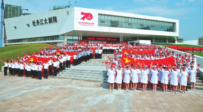 本报27日讯(德健宇记者孙昊高明)27日下午,牡丹江市大剧院门前广场人潮涌动,来自全市各战线的党政机关干部、教师学生千余人汇集于此,共同参加佩戴国旗徽章活动,以此表达对国旗、对人民、对祖国最深厚、最炽热的情怀。 当日下午,参加活动的机关干部、教师学生早早地汇聚在广场上,一起挥舞手中的国旗。当《我爱你中国》优美的旋律响起时,人们把国旗徽章佩戴在彼此的胸前。随后大家有序地与国旗合影,表达对祖国的热爱与祝福之情。快闪《我和我的祖国》,唱出了每一个人对祖国无限的热爱与依恋。大家还共同观看了音乐剧《国之当歌》,讲述了人民音乐家聂耳和戏剧家田汉相知相识、共同谱写《义勇军进行曲》振奋中华的故事。结尾时,全场起立,演员与观众同唱《义勇军进行曲》《歌唱祖国》,将现场气氛推向了高潮。 活动现场。刘鑫本报记者高明摄
