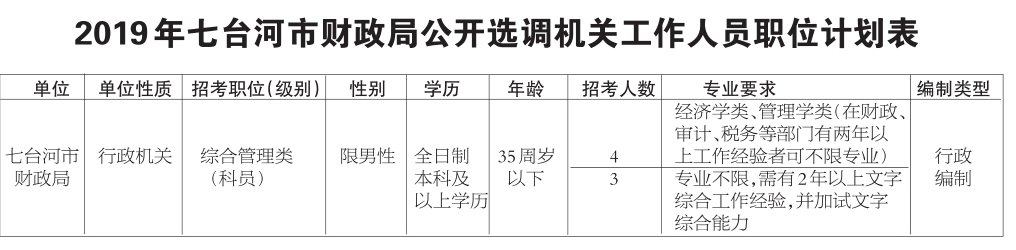 根据工作需要,七台河市财政局决定在全省各级机关中公开选调机关工作人员7名。现将有关事宜公告如下: 一、选调范围和数量 面向全省各级机关具有公务员身份的一般干部,选调7名工作人员到七台河市财政局机关科室工作。 二、资格条件 选调人员应当符合《中华人民共和国公务员法》《党政领导干部选拔任用工作条例》等所规定的基本条件,同时应具备下列条件: 1、具有公务员身份(不含参公)的一般干部; 2、具有正常履行职责的身体条件; 3、参加工作以来,年度考核结果均为称职及以上等次; 4、年龄在35周岁及以下(含35周岁,截止时间为公告发布之日); 5、统招本科及以上学历; 6、具有2年以上机关单位工作经历(不含试用期),计算工作经历年限的截止时间为2019年6月; 7、文字综合能力突出者优先录取; 8、符合国家法律、法规和其他有关规定的条件。 具有下列情形之一的,不得参加选调: (1)有违法违纪或涉嫌违法违纪行为的; (2)按照国家有关规定,到定向单位工作未满服务年限或有其他限制性规定的; (3)新录用公务员尚在试用期的; (4)艰苦边远地区服务期未满3年(含试用期); (5)省委选调生在所分配的基层工作岗位工作未满最低服务年限的; (6)法律、法规及有关政策规定的其他限制情形。 三、选调程序 (一)发布公告 通过《黑龙江日报》、七台河市人民政府网站、《七台河日报》、七台河市财政局(微信公众号)等向社会发布公告。 (二)报名 1、报名方式。采取组织推荐或个人自荐相结合的方式进行,七台河市财政局人事教育科按照规定条件将对报名人员进行资格审查,参加笔试报名人数须达到3:1,如达不到比例要求,相应缩减选调名额。 2、报名时间。报名时间截止到2019年7月15日17:00前。 3、报名材料。报名人员自行填写《七台河市财政局公开选调工作人员报名登记表》,并将填写完整的报名登记表、本人身份证(正反面)、毕业证、学位证、《教育部学历证书电子注册备案表》电子版,一并发送至邮箱qthczj gy@163. com。 (三)笔试 采取闭卷方式,主要测试政策理论水平、分析和解决实际问题能力、文字表达、业务知识、公文写作等综合素质,满分为100分。文字综合岗位另进行文字综合能力测试,满分30分。具体考试时间、地点及有关事宜以电话通知为准。报考者必须持本人有效二代身份证参加考试。本次考试不指定复习资料,不举办也不委托任何机构举办考试辅导培训班。 (四)面试人选资格确认 1、通过笔试后进入面试人员需携带以下材料(复印件A4纸张)进行现场资格确认:《公务员登记表》、全国干部人事档案专项审核工作专用《干部任免审批表》、《干部基本信息审核认定表》、单位同意报考证明及廉政鉴定加盖所在单位干部人事部门公章。 2、未按时提供相关材料的,视为自动放弃面试资格,按笔试成绩从高到低依次递补。 3、通过资格审核人数与选调计划人数比例原则上应达到3:1以上,如达不到比例要求,相应减少或取消选调名额。 4、电话通知资格审核通过的人员参加面试。 5、资格审查贯穿全过程,在任何一个环节发现报考人员有不符合报考条件的情况,领导小组办公室有权取消其进入下一环节的资格。 (五)面试 完成阅卷、成绩核算后,根据笔试成绩,从高到低排名,按选调计划数3:1的比例确定参加面试资格复审人员,采用电话通知的方式告知入围面试人员。面试采用结构化面试的方式,主要测试应变能力、语言表达能力、综合分析能力、逻辑思维能力、举止仪表等。面试满分为100分。 (六)考试总成绩计算 综合成绩满分为100分(文字综合岗位满分为112分),笔试权重占40%,面试权重占60%。计算方法:综合成绩=笔试成绩×40%+面试成绩×60%,分数保留小数点后两位。 (七)考察和体检 根据考试总成绩,按选调人数1:1的比例从高分到低分确定进入考察人选。若总成绩出现并列,以面试成绩高者优先。考察不合格者取消录取资格,该岗位按考试总成绩依次递补。考察结束后,按照录用公务员标准统一组织体检。 (八)公示、试用 根据考试成绩、考察和体检情况,确定拟录用人选,在七台河市人民政府网站、七台河市财政局(微信公众号)进行公示。公示期满无异议的,分配到工作科室进行为期三个月的试用。 (九)试用期满与办理调转手续 试用期满后,对试用期间的思想政治表现、工作作风、工作实绩和廉洁自律等情况进行考核,同时重点考核所在岗位的适应能力和履行职责的情况。试用期满考核合格后,按有关规定办理调转手续。经考核不能胜任选调职位的,安排回原单位工作。 四、纪律要求 参加选调考试人员在整个过程中不得弄虚作假或以其他不正当手段获取选调资格,一经查实,予以取消选调资格。 五、其他事项 报名时请按要求认真填写电子邮箱和手机号码,并保持通讯工具畅通。因电话不通影响选调的,责任自负。凡未入围下一环节人员,均不另行通知,可通过拨打咨询电话查询。 六、咨询、监督电话 咨询电话:0464-8688099 0464-8688066 监督电话:0464-8688023 此公告未尽事宜由七台河市财政局负责解释。