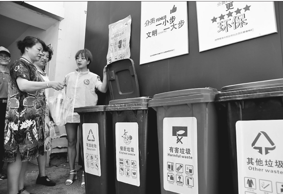 10日,哈尔滨市道里区安化北段社区内,志愿者向居民讲解分类回收垃圾的作用和意义,以及四色分类垃圾桶的使用方法等,居民根据垃圾桶的不同颜色投放垃圾。