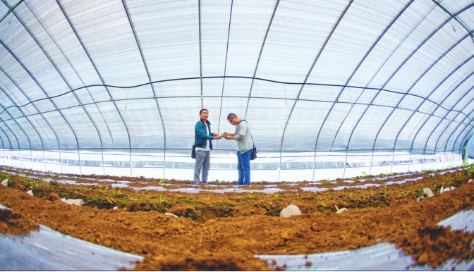 陈程(左)指导村民利用闲置的羊肚蘑大棚套种西瓜。 本报记者刘心杨摄