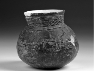 白金宝文化是嫩江流域发现年代较早,材料积累较多,时间位置处于“古城类型”之后、汉书二期文化之前的一种青铜时代遗存。该文化的命名得于以白金宝遗址第三期为代表的遗存,其遗址材料还发现于黑龙江省肇源古城、望海屯、卧龙等处。其文化特征是以绳纹、篦纹、三足陶、半地穴式房址为代表,经碳十四测定,树轮校正年代距今2900±100年,应处在青铜时代晚期,大致相当于中原的西周时期。 白金宝文化的篦纹陶在我国北方各区系陶器纹饰中独树一帜,其工艺有特定的时空范畴和文化内涵的定性。经学者研究得知,白金宝文化陶器的篦纹系采用平行缠绕纤维或细绳的片状工具,以工具的锐边在陶器表面施压而成,一般有明显压印的线形凹槽,“篦点”上仍留有纤维或绳股痕迹。 这件陶壶便是白金宝文化众多篦纹陶的代表之一,陶壶为泥质灰褐陶,泥条盘筑法制成,手制,器壁薄,直颈侈唇,扁圆腹,口径6.8厘米,底径4.5厘米,高9.5厘米。颈部饰有篦纹组成的网格纹;腹部饰有篦纹组成的变体蛙纹,蛙纹由两蛙相叠,肢爪仅各表现出一对;变体蛙纹间饰有篦纹组成的图案,从朱永刚先生的《白金宝文化篦纹陶纹饰初论》一文来看,应是鹿纹。 白金宝遗址历经了三次考古发掘,发现大量房址、窖址、灰坑等,出土有陶器、骨器、蚌器、石器、青铜饰件等数千件,它的发现可以说是松嫩平原保存面积最大,延续时间较长,遗存非常丰富的文化遗存,确立了这一地区青铜至早期铁器时代比较完整的考古文化发展序列,对研究松嫩流域古代文化具有重要学术价值。(黑龙江省博物馆冯骏)
