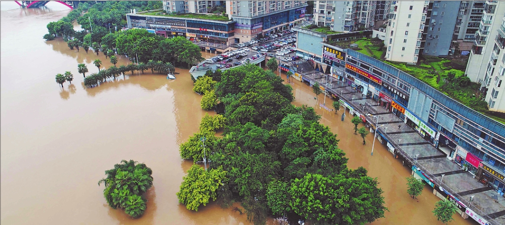 7月14日,柳州市滨江西路被上涨的洪水淹没(无人机拍摄)。