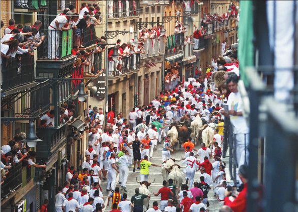 7月13日,在西班牙潘普洛纳,人们参加“圣费尔明”奔牛节。一年一度的西班牙“圣费尔明”奔牛节6日在北部城市潘普洛纳拉开帷幕,将持续至14日。