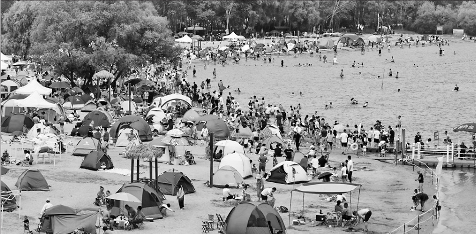 左图:市民和游客在公益浴场戏水。本报记者苏强摄